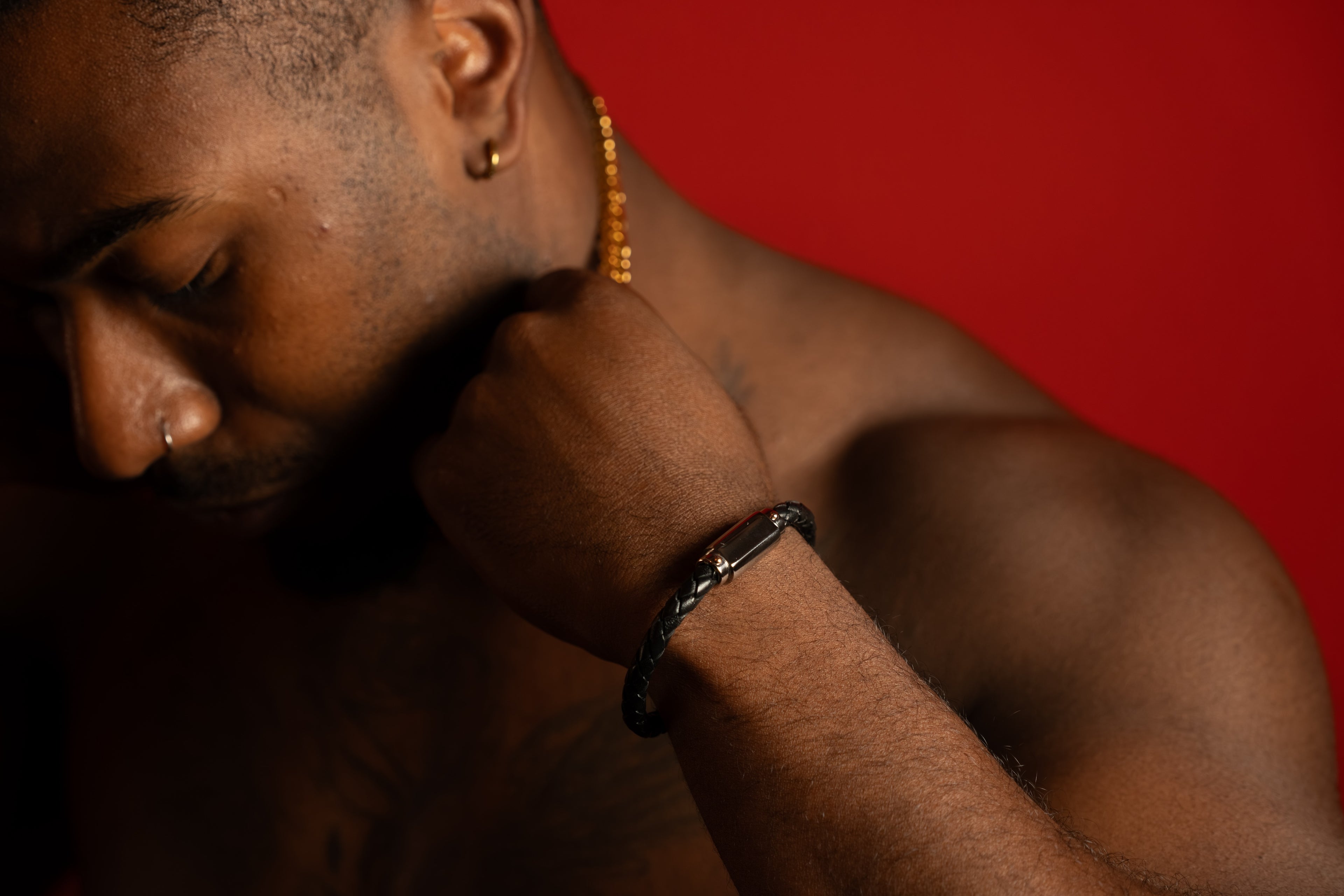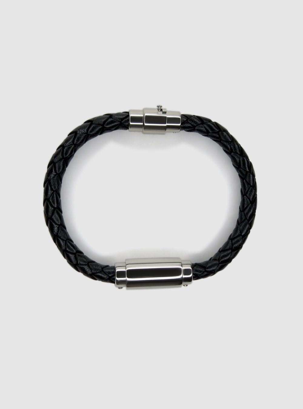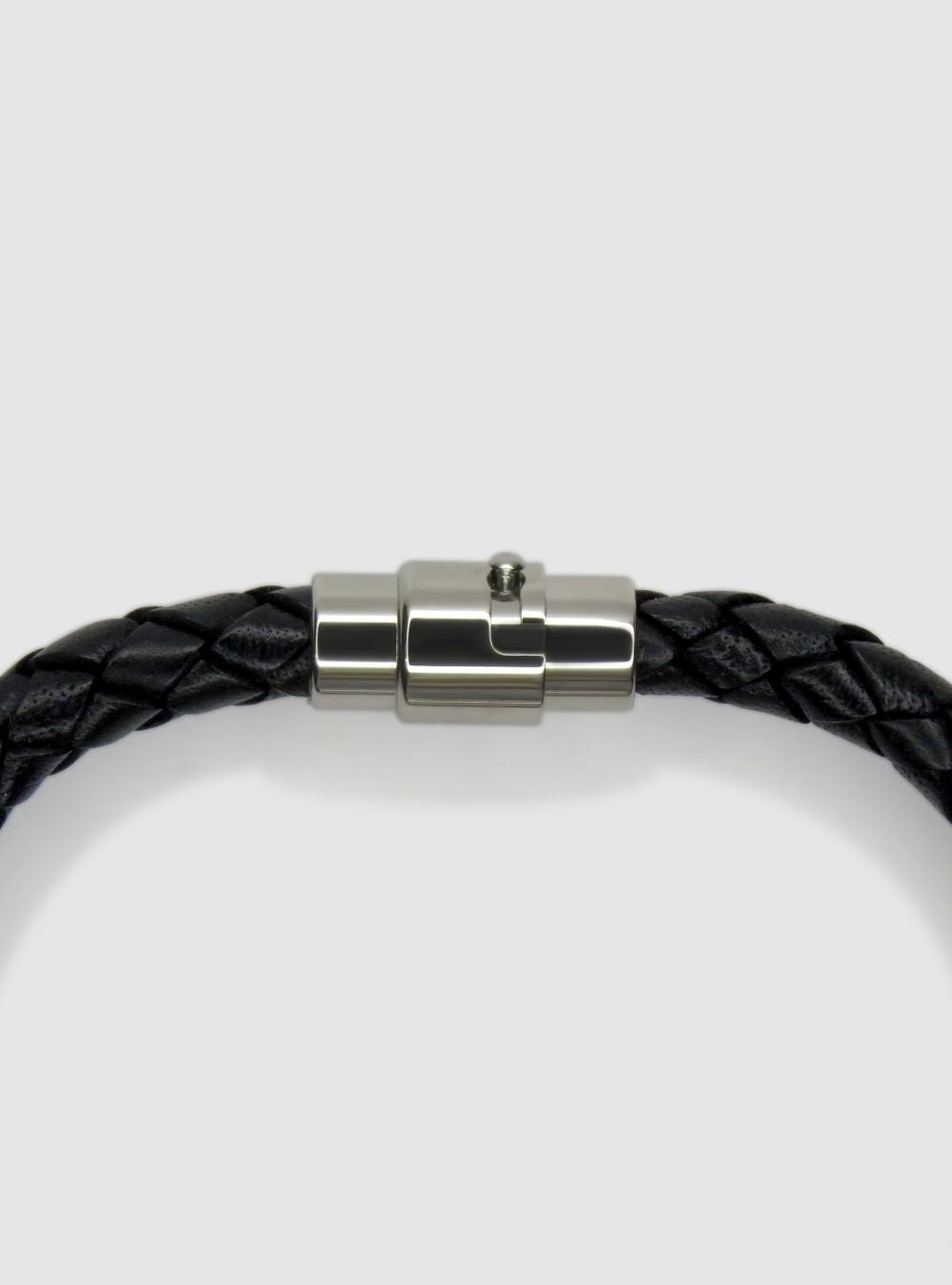 This bracelet features a 6mm black braided leather band paired with a sleek, polished ID plate in stainless steel. The plate’s clean rectangular shape is accented by subtle screw details for a modern industrial finish. A strong magnetic bayonet clasp with a robust twisting mechanism ensures a secure connection, making it a bold yet refined accessory.