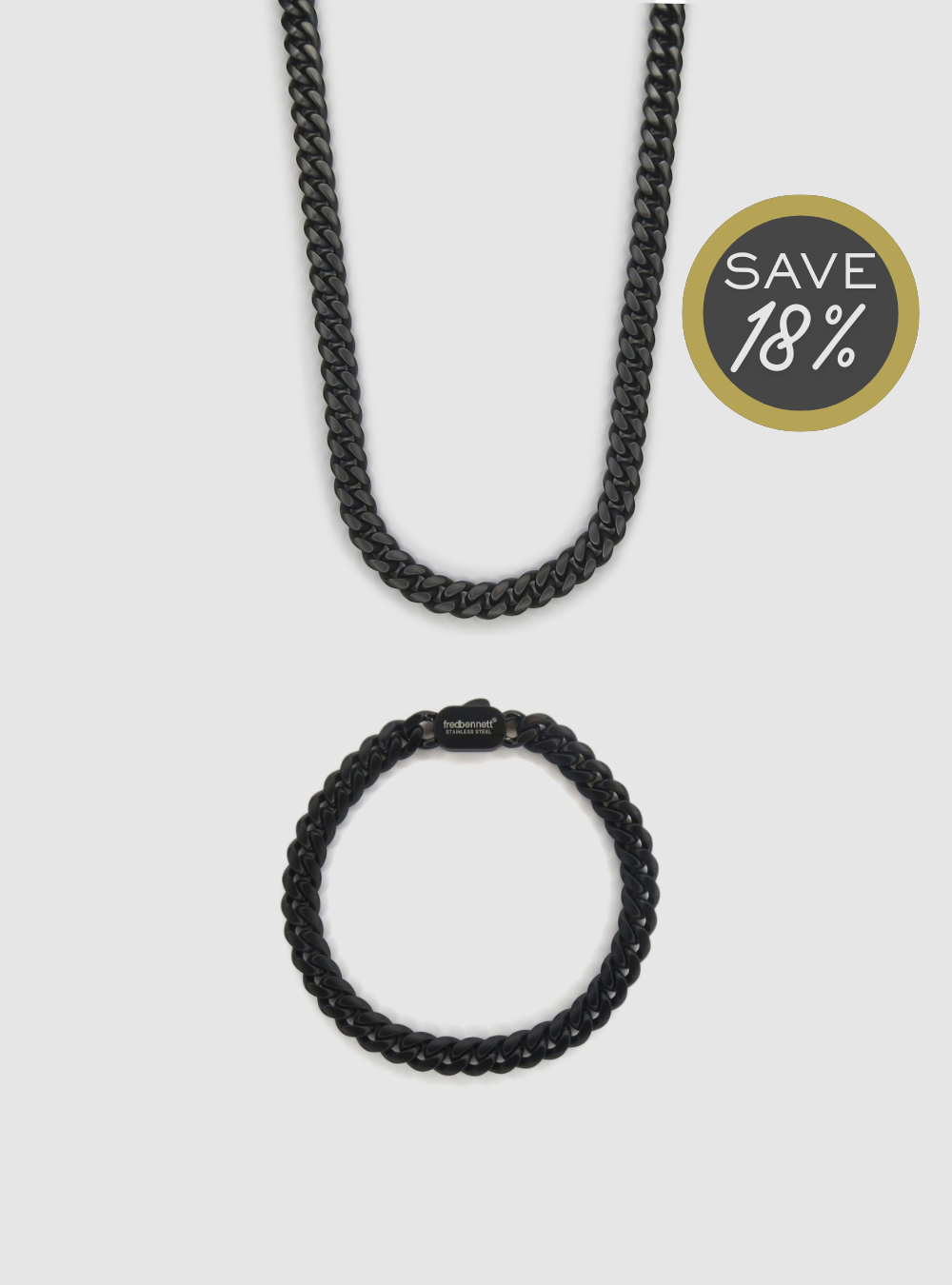 A bold, modern pairing in matte black. The Black Brushed Gift Set brings together the Black Brushed Curb Chain and the Black Brushed Curb Chain Bracelet - two pieces designed with a sleek brushed finish that gives them a refined, understated edge. The chain offers a clean, contemporary profile, while the matching bracelet adds balance and structure, creating a coordinated look that works effortlessly.