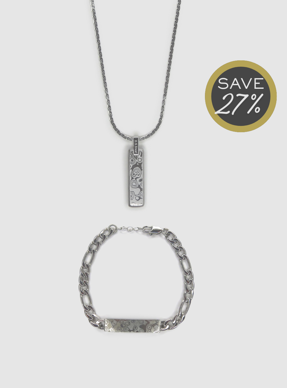 The Damascus Gift Set brings together the Damascus Steel ID Bar Chain Bracelet and the Damascus Steel Narrow Bar Pendant - two statement pieces designed to showcase the distinctive rippled grain unique to layered Damascus steel. The bracelet features a solid bar set into a rugged chain, while the pendant offers a slimmer bar design that catches the light with its natural patterning. Worn together, they create a cohesive, modern set with real character.