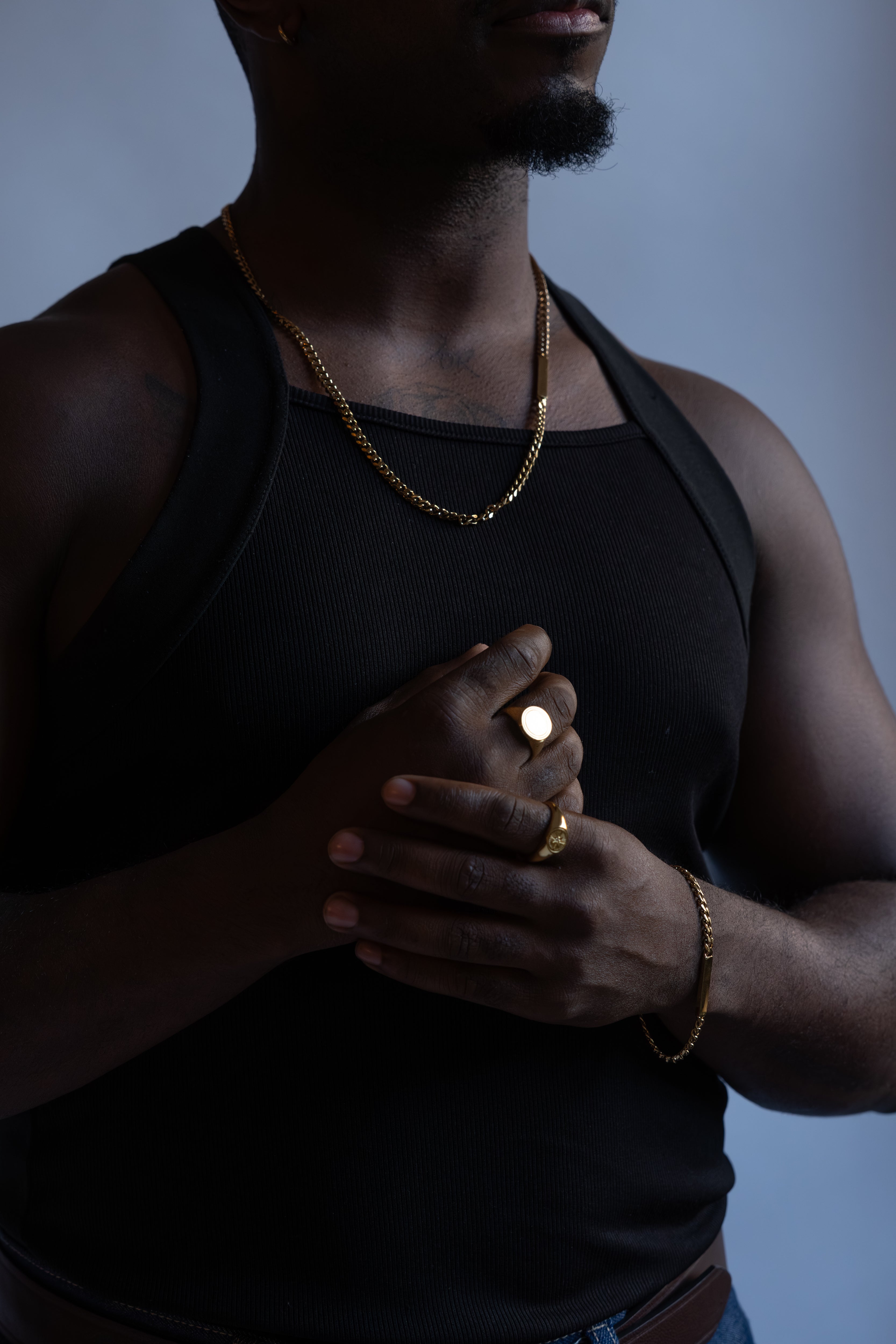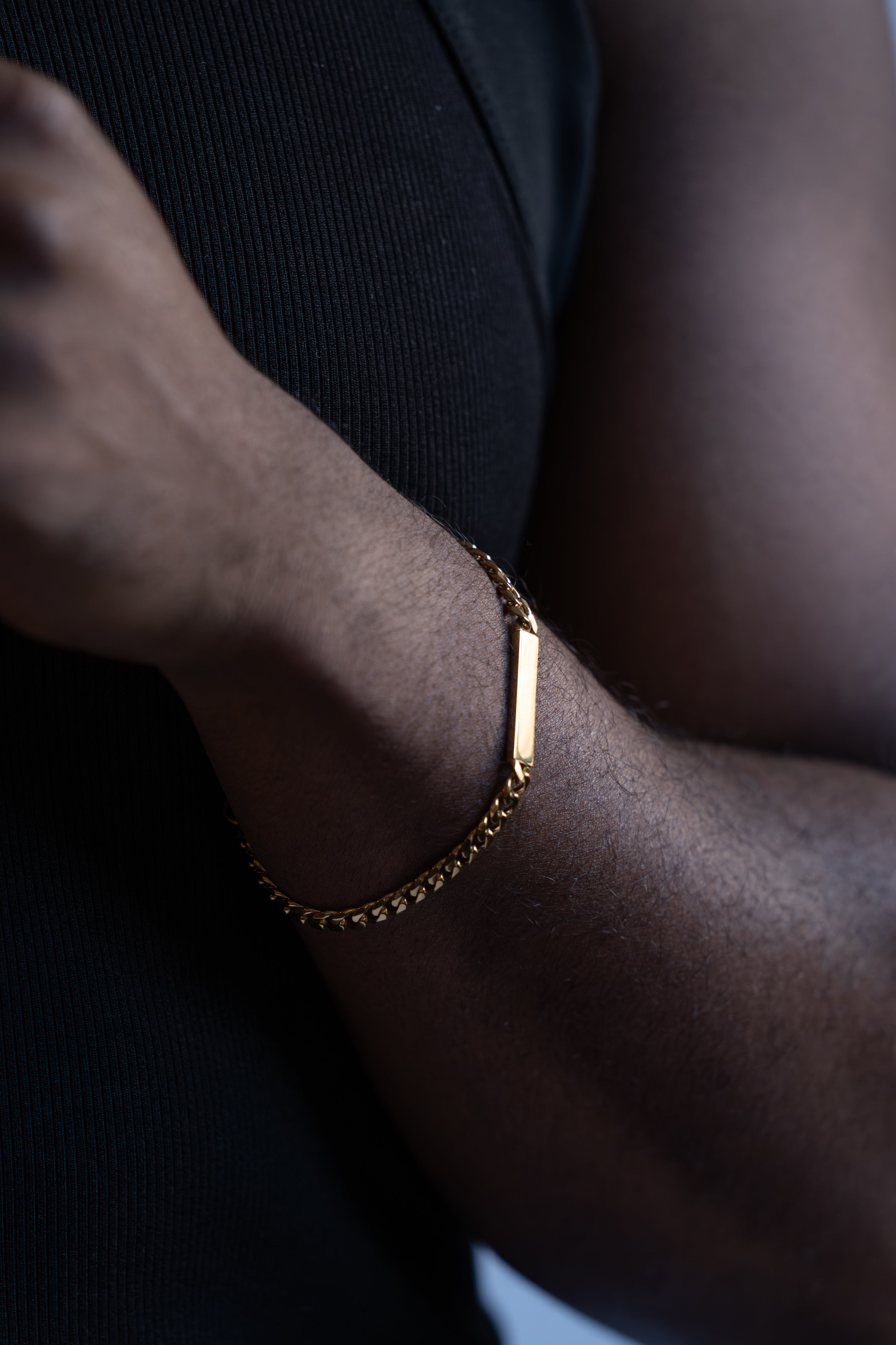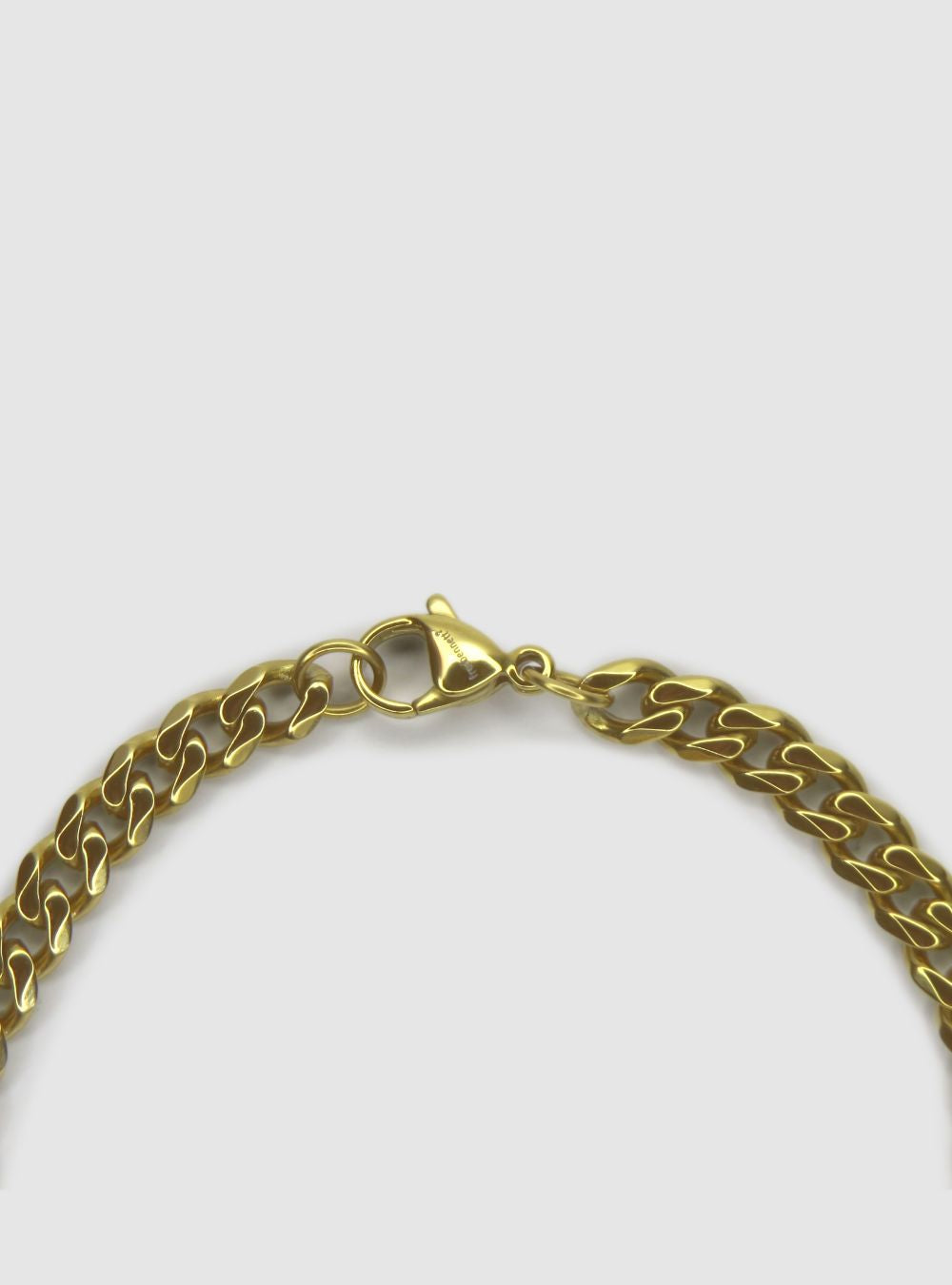 Crafted in robust stainless steel and finished with a rich plated yellow gold coating, this bracelet offers a clean, refined look with a touch of shine. The classic chain design is balanced by a smooth bar detail, creating a sleek contrast of texture and form. Effortlessly wearable and versatile, it’s a timeless piece that transitions seamlessly from everyday looks to evening style.