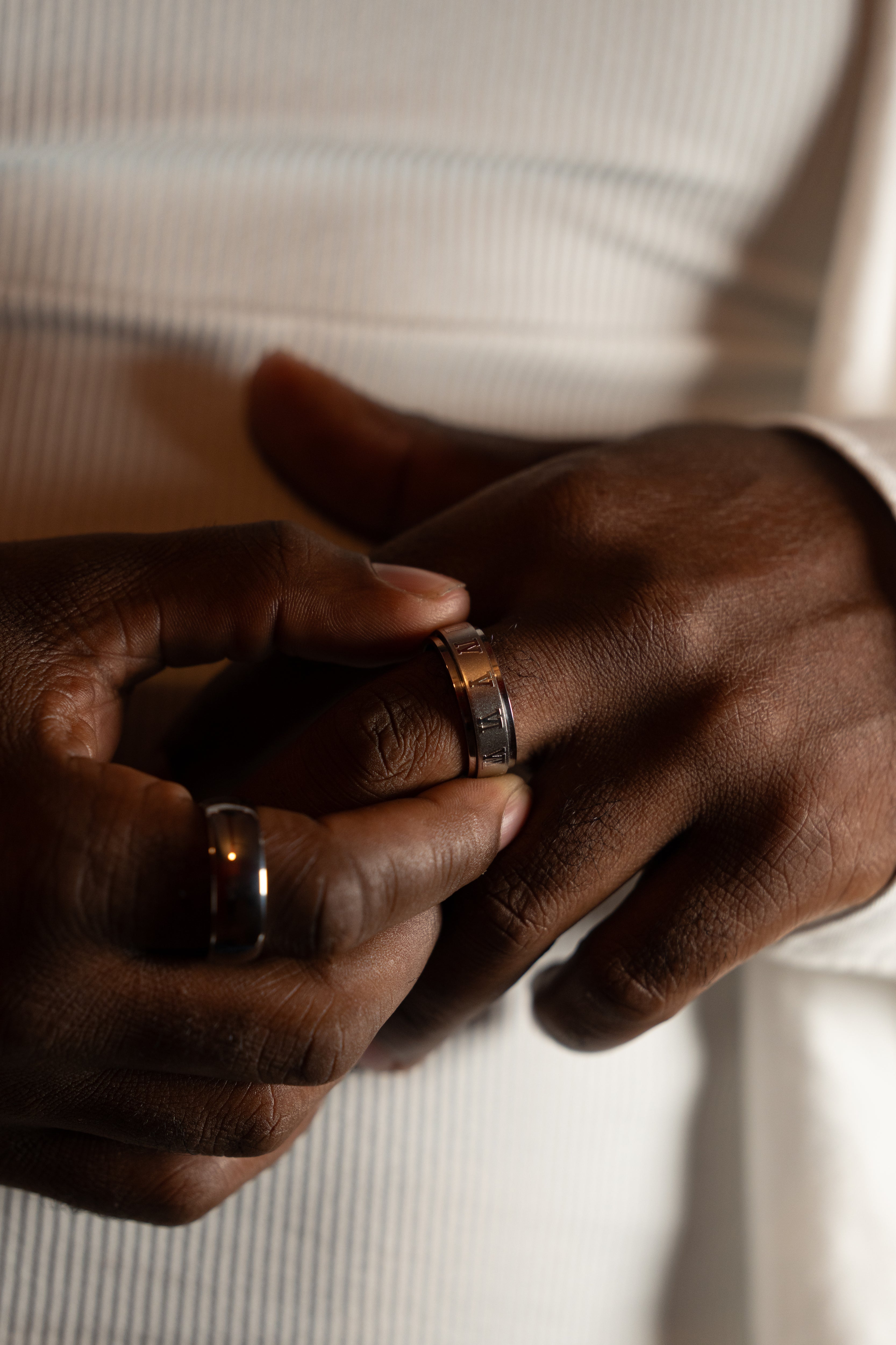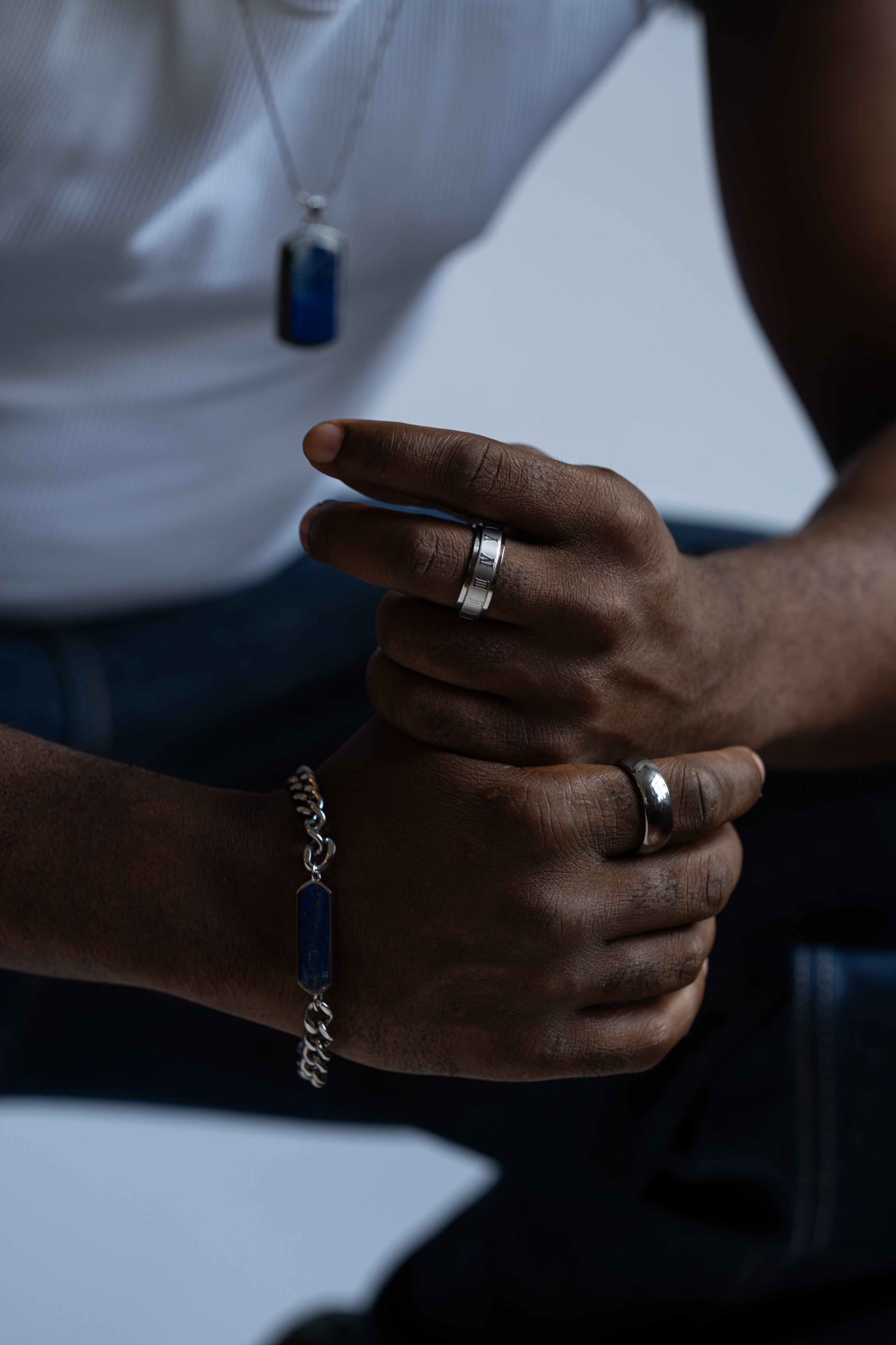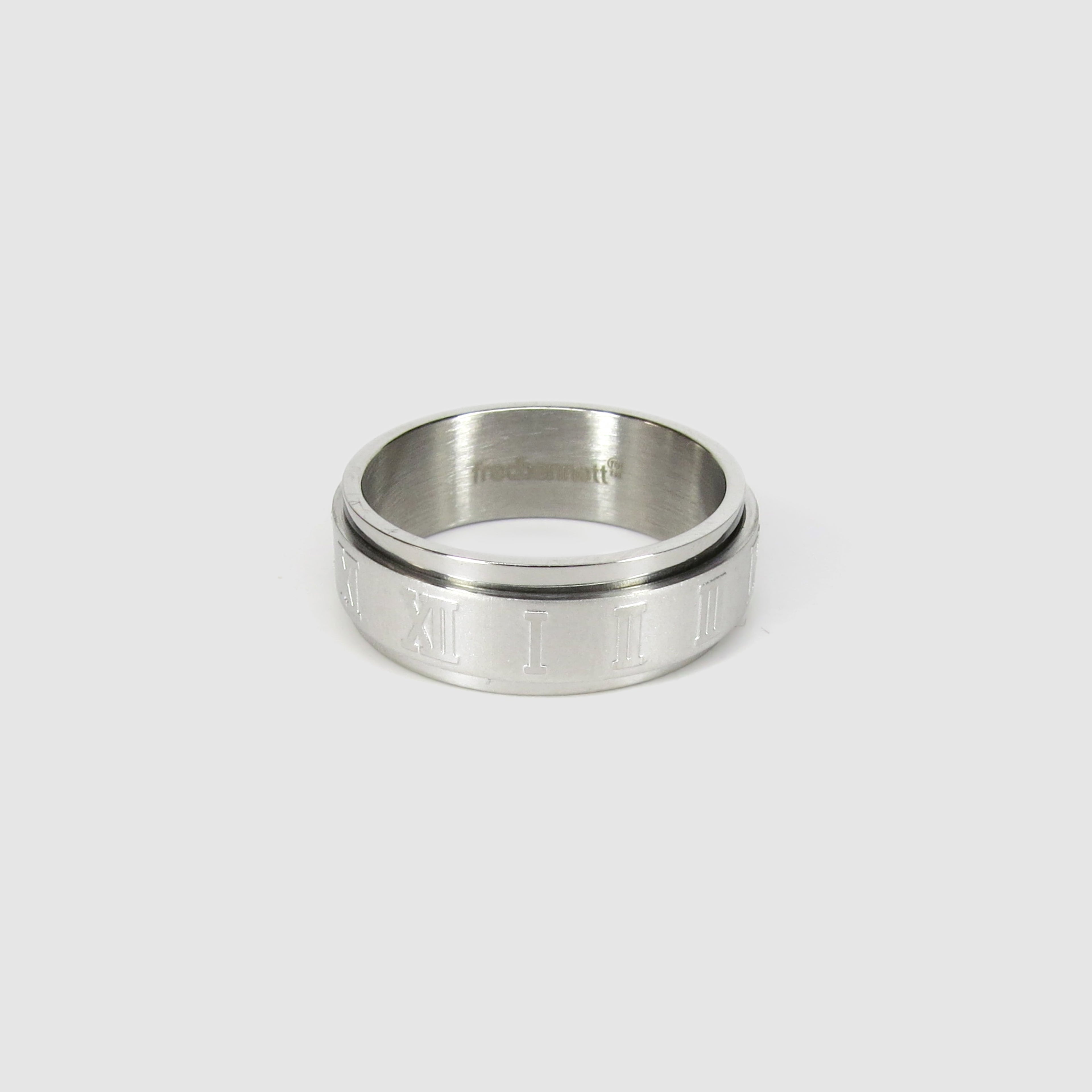 A bold fusion of style and function, this durable stainless steel spinner ring features a rotating centre band precisely engraved with Roman numerals. The smooth spin adds a subtle tactile feel, while the brushed finish keeps the look sharp and minimal and offers an interesting contrast to the polished silver tone outer band. A timeless everyday piece that blends movement, style, and simplicity.
