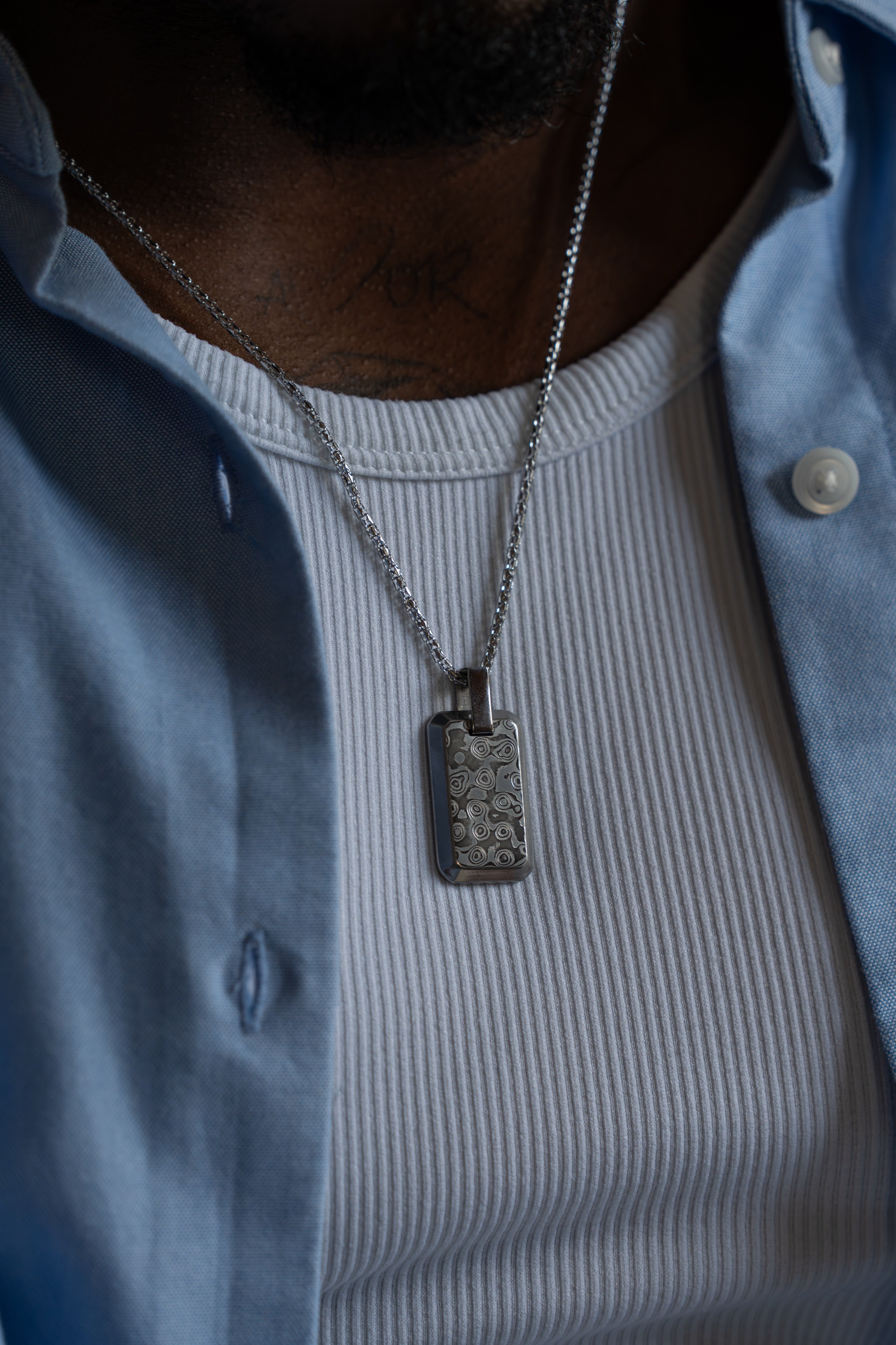 A contemporary take on a classic form. This pendant is crafted in Damascus steel, showcasing its flowing, patterned surface with a clean, polished finish. The cool silver tones and subtle texture give it depth without distraction, while the smooth steel border adds a refined edge. Designed for everyday wear, it’s a statement in craftsmanship - durable, balanced, and effortlessly modern.