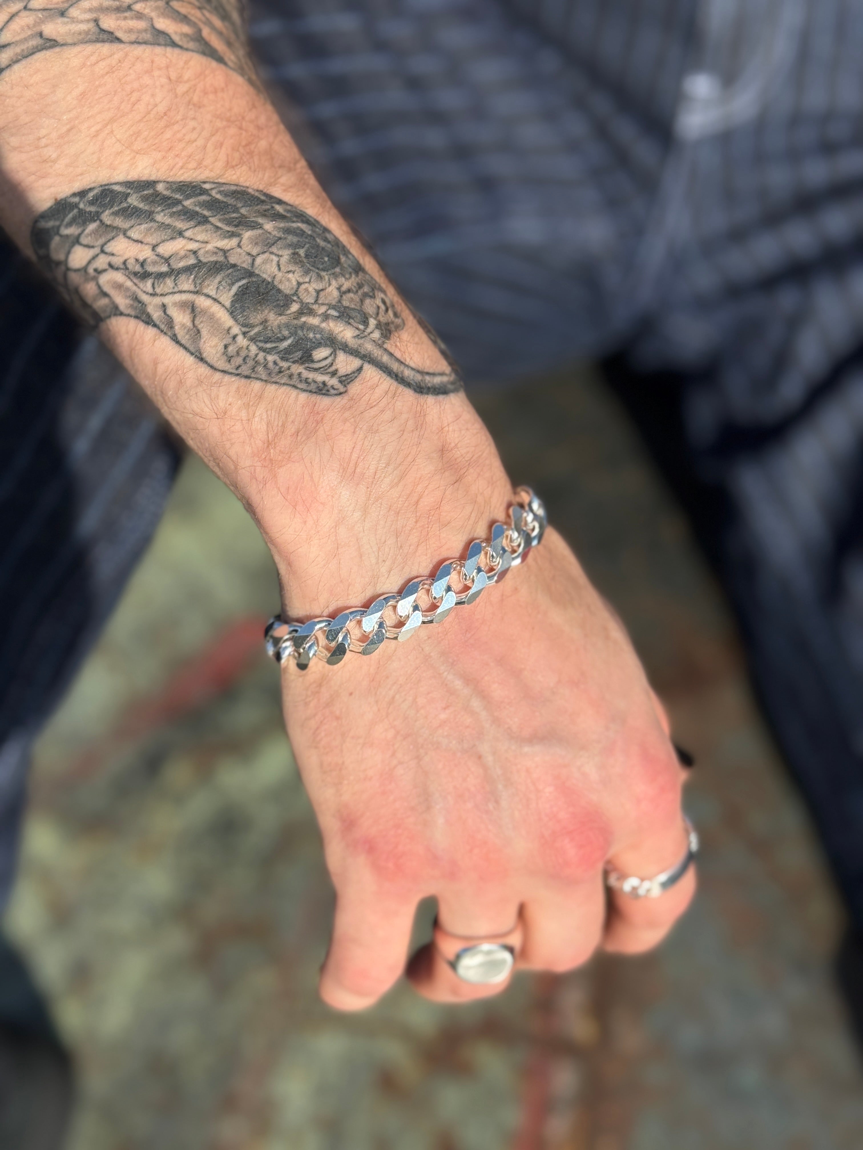 Bring real presence to your wrist with this heavyweight diamond cut bracelet. Crafted from solid 925 sterling silver, it features sharp, precision cut links that reflect the light for a bold, polished finish. Built for everyday durability, it works effortlessly on its own or paired.