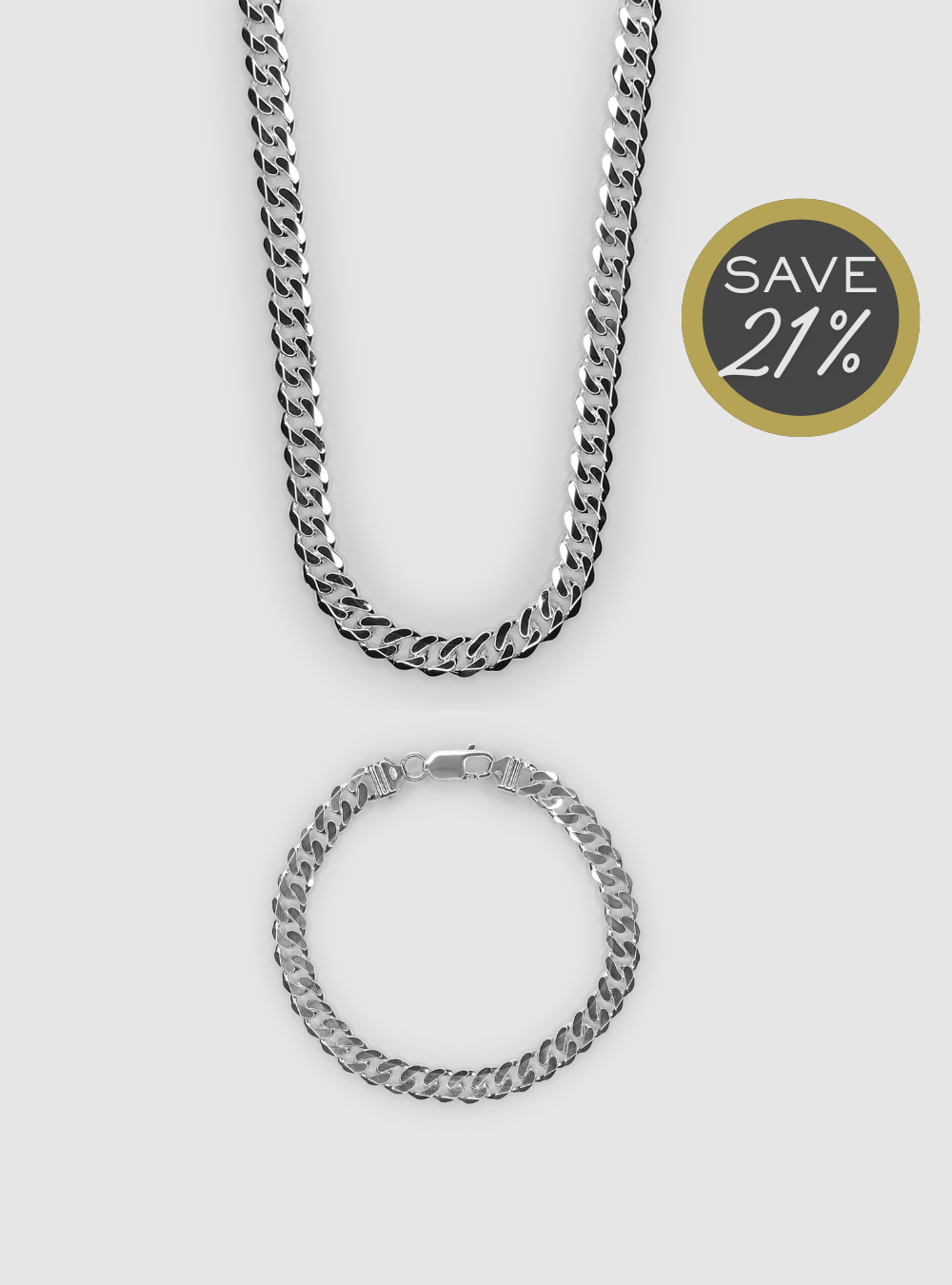 This set brings together two standout pieces - a chunky 8mm sterling silver curb chain and a 6mm bracelet. Each one features tightly interlocked links for a solid, weighty feel and a polished finish that catches the light just right. Wear them together for a coordinated statement or mix them into your everyday rotation for an effortless upgrade.