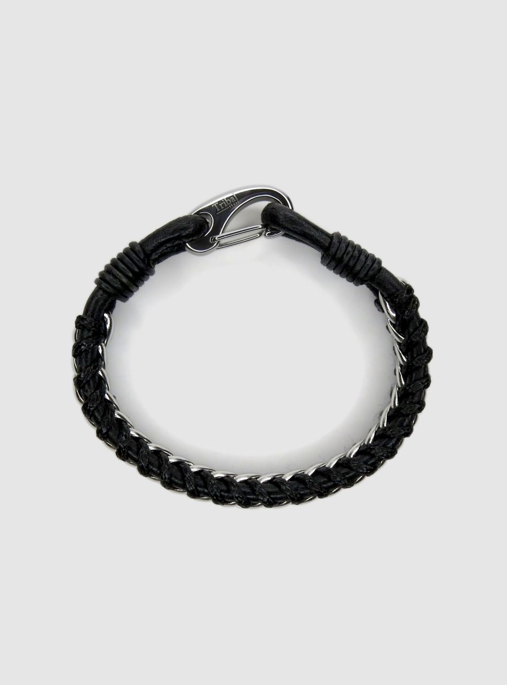A bold and wide 11mm black leather and wax cord bracelet with thick woven texture and prominent stainless steel chain woven through the centre. The wrapped ends and large shrimp clasp create a secure, street-style look. Strong, structured, and built to stand out.