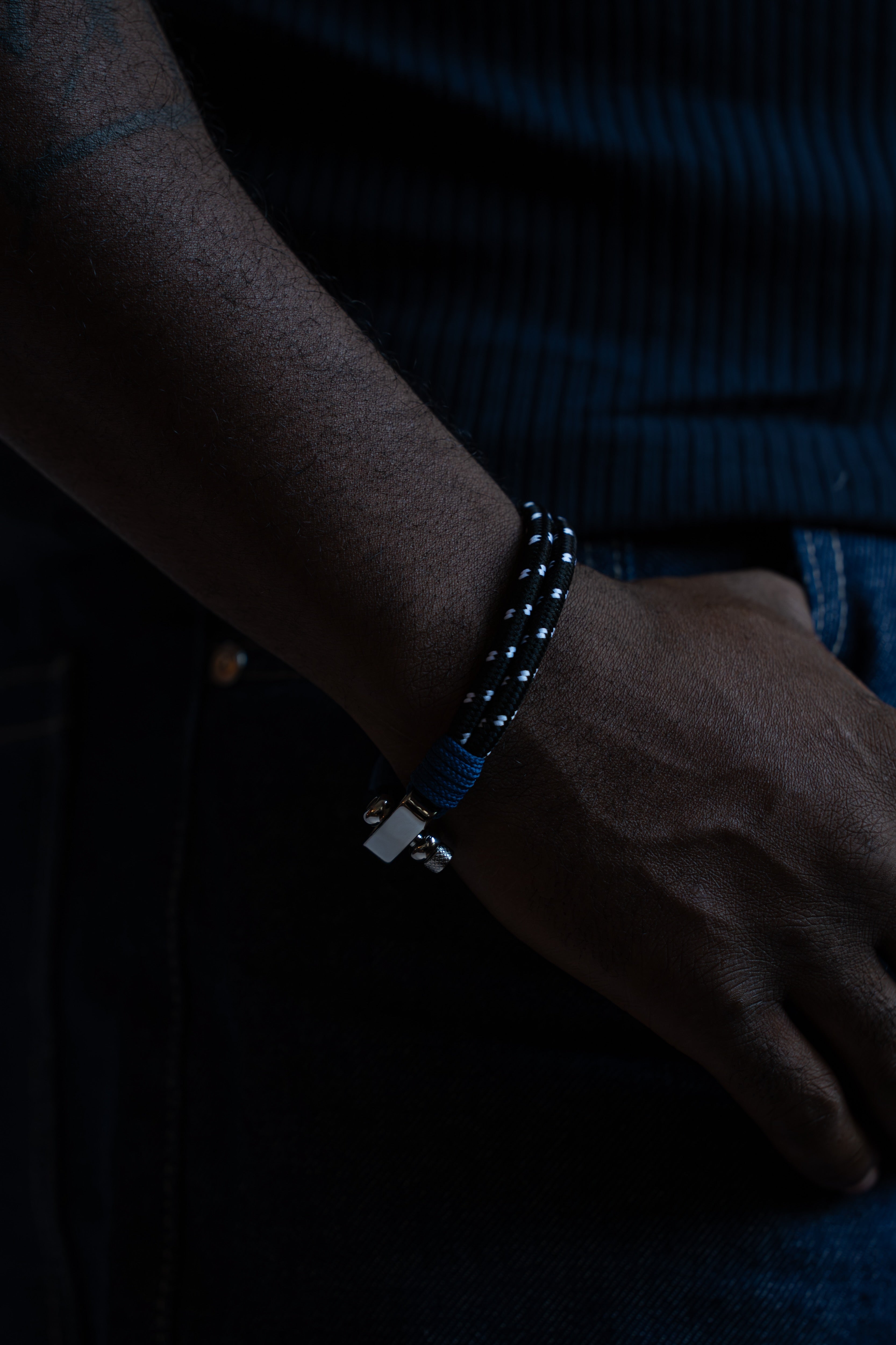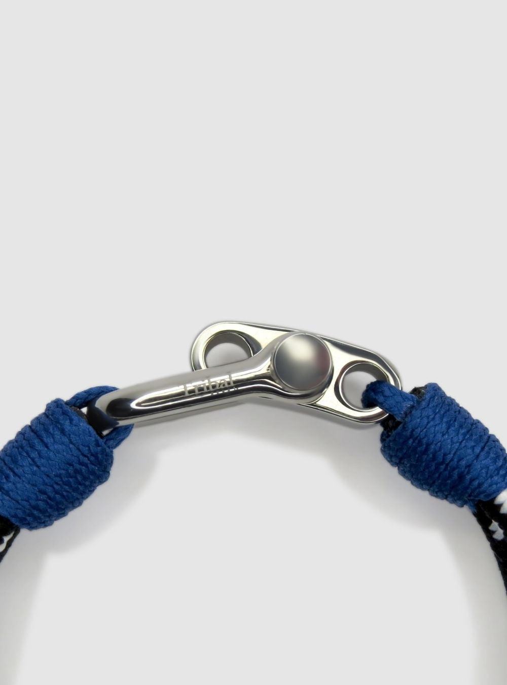 This bold sports bracelet features double-layered black nylon rope with white stitch accents and striking blue wraps near the clasp. Finished with a polished stainless steel clasp with 2 positions for adjustable sizing, it balances rugged durability with a clean design.