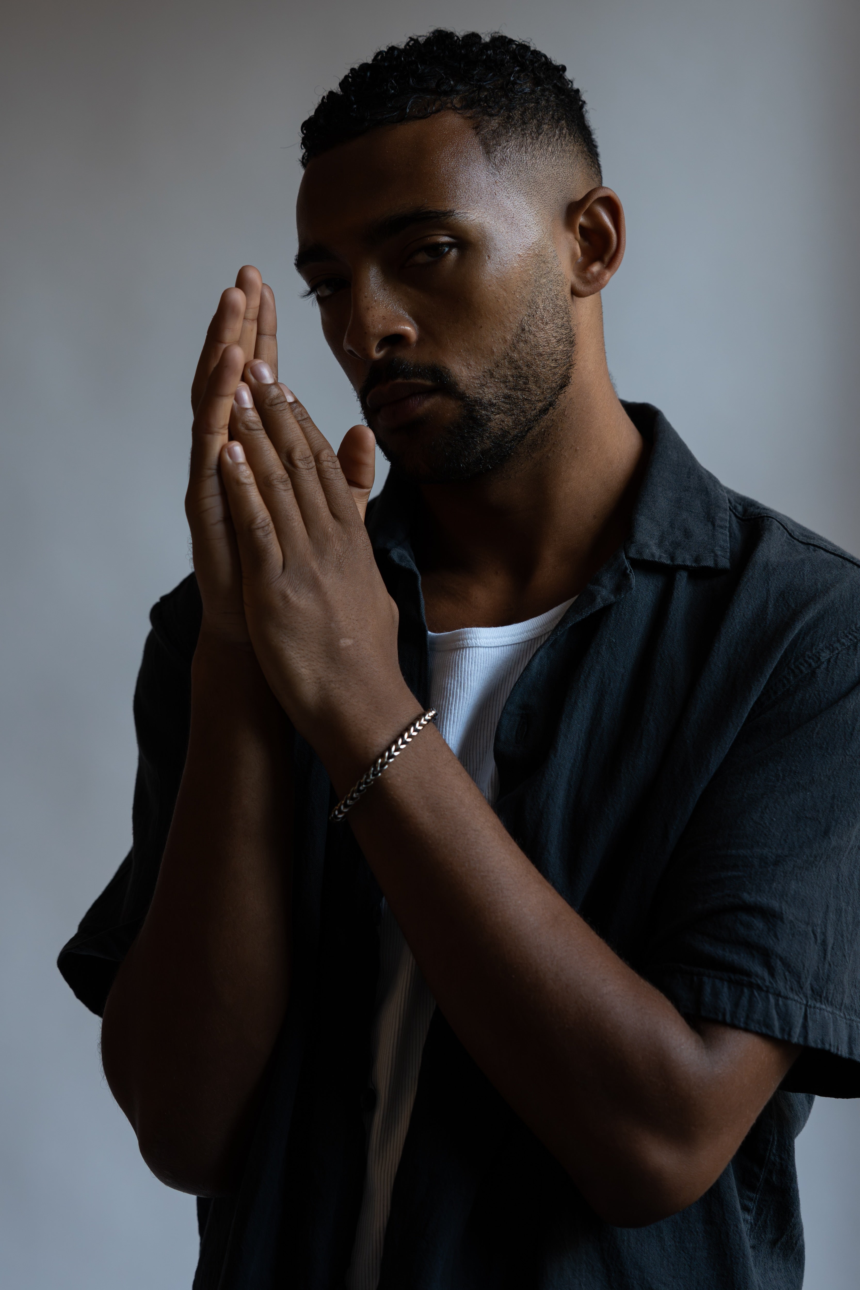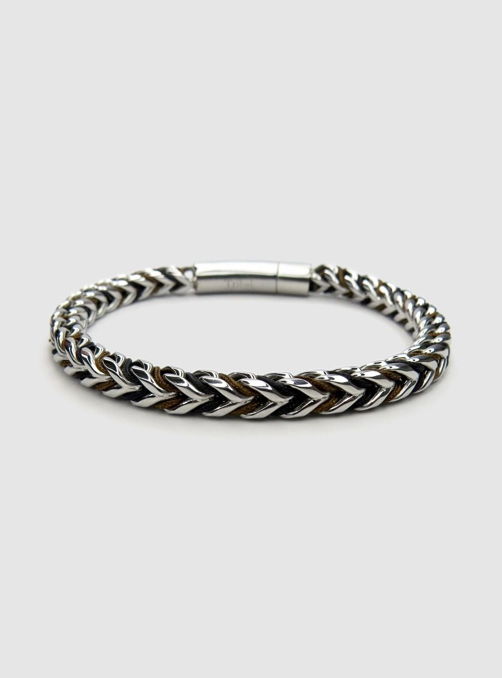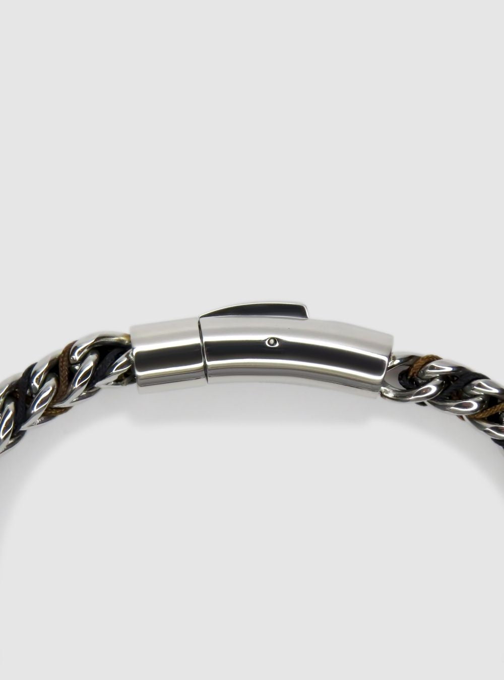A braided chain bracelet combining stainless steel with interwoven strands of brown and black cord for subtle contrast. The intricate patterning adds visual texture while maintaining a sleek, modern silhouette. Secured with a discreet lever clasp for a seamless finish.